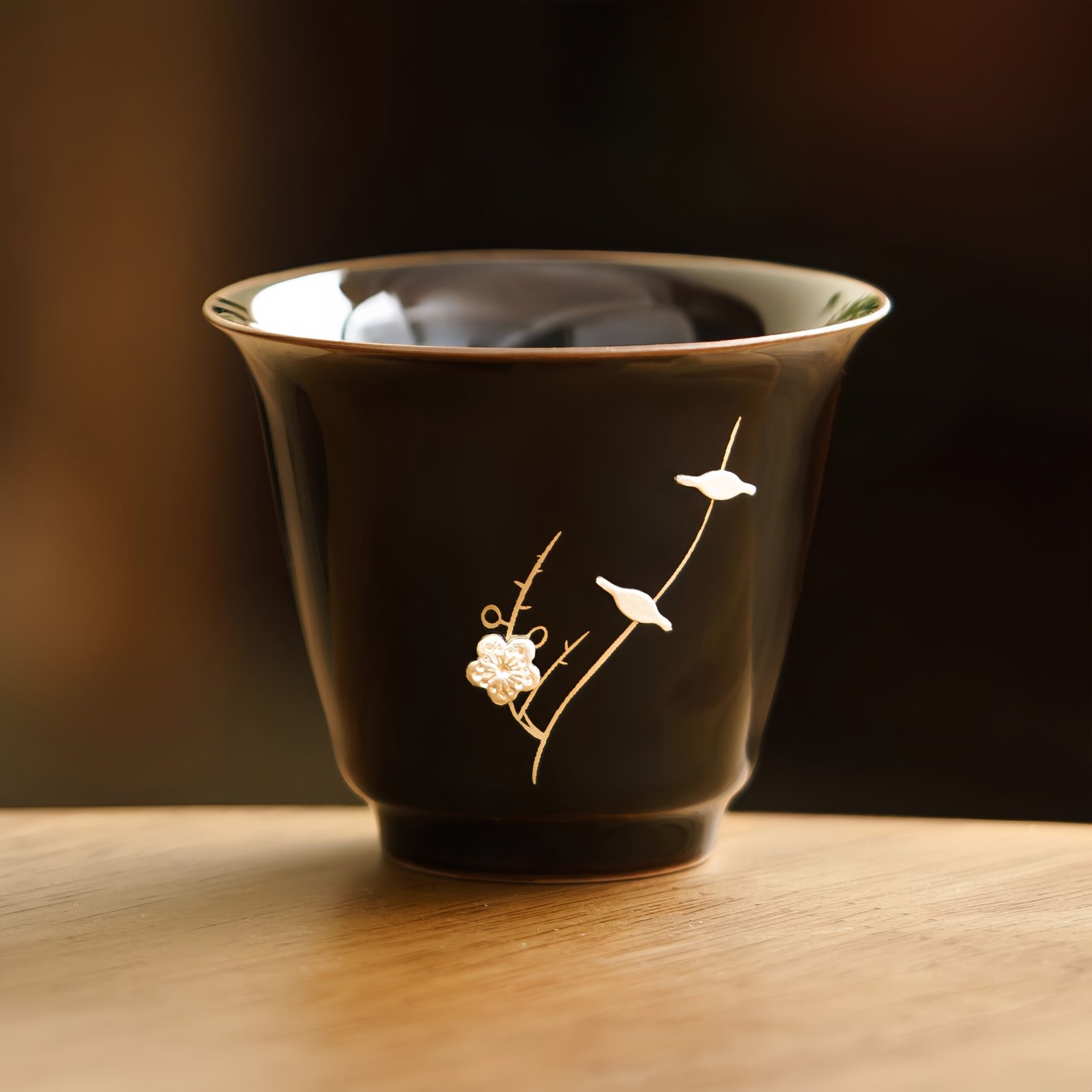 Perfectly fusing practicality with sophistication, this teacup is a testament to the synergy of utility and art. Hand-thrown on traditional potter’s wheels and fired at high temperatures, it is designed to enhance your tea-drinking moments with a touch of Eastern Zen and understated luxury. Highlighting meticulous handwork, the artisan carefully inlays delicate plum blossoms into the ceramic surface. These blossoms, subtly blooming with their branches, lend charm to the dark glaze, creating a visual effect that feels both poetic and timeless.