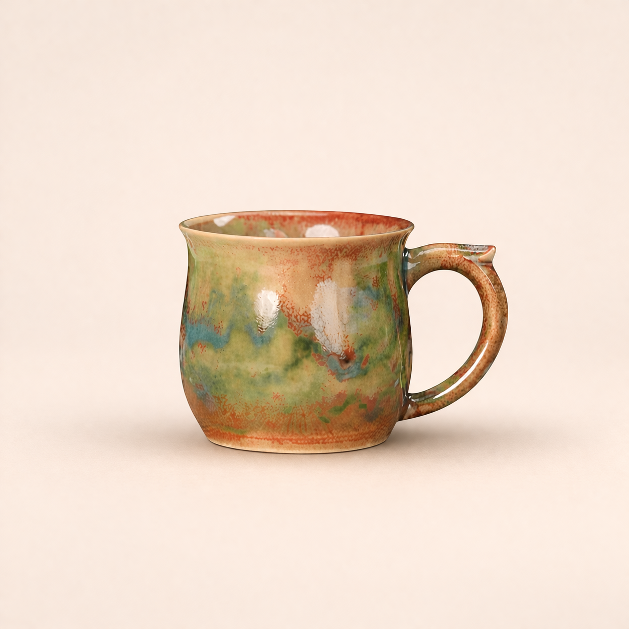 This mug stands out with its dynamic glazing, featuring a green base interwoven with earthy red-brown kiln effects. Every firing results in one-of-a-kind patterns, ensuring that no two mugs are identical. The glazing layers create a rich texture and artistic depth, bringing an elegant touch to any beverage moment while celebrating the beauty of natural craftsmanship.