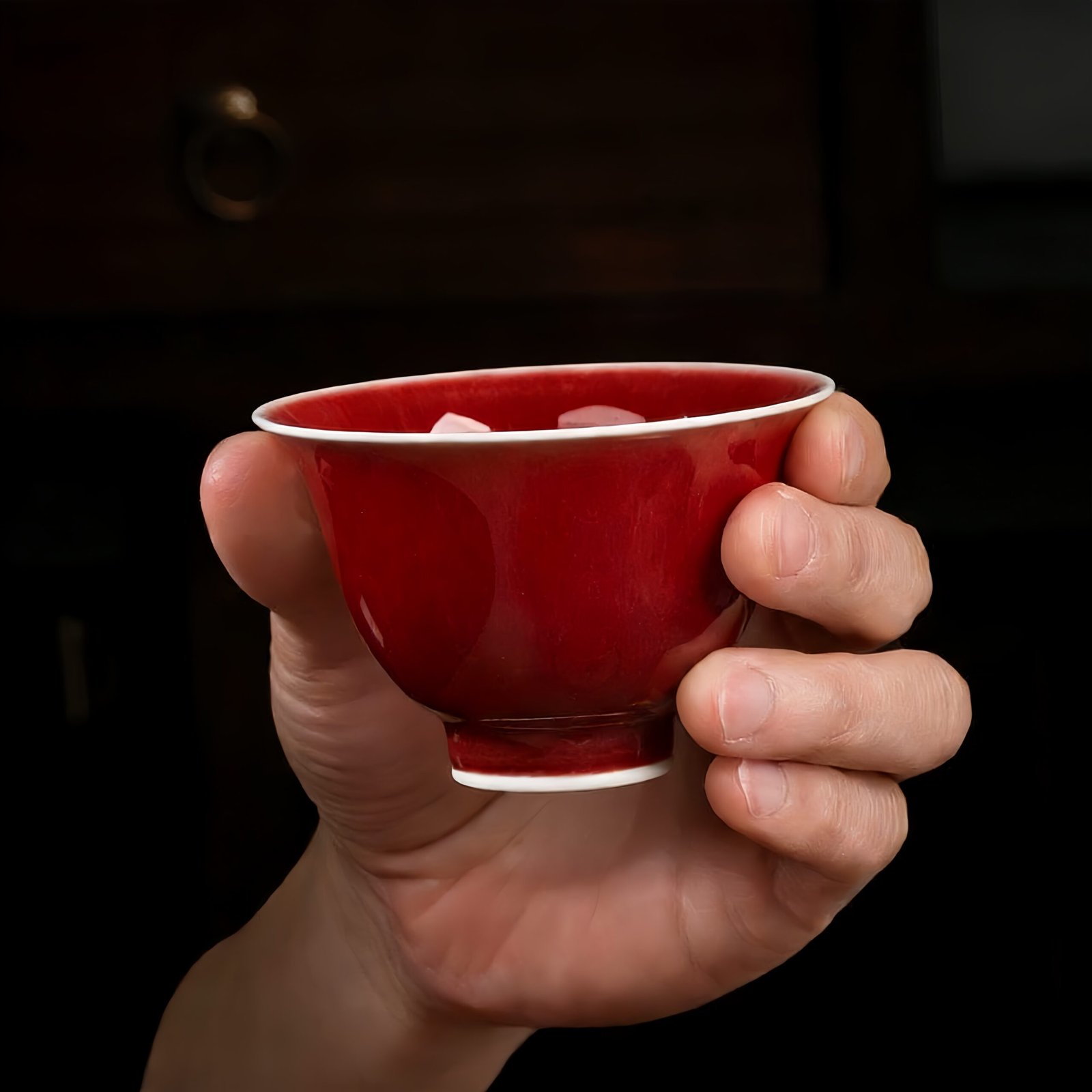 This Langyao red glaze teacup is a stunning testament to the beauty and craftsmanship of traditional Qing Dynasty imperial kilns. Created using the honored red copper glaze technique and fired under high-temperature reduction flames, its glaze color radiates a bold, vivid crimson akin to freshly condensed oxblood. With a lustrous, translucent surface and naturally formed crackles, its refined appearance embodies the classic characteristics of ‘clean cuts, flowing yet contained edges.’