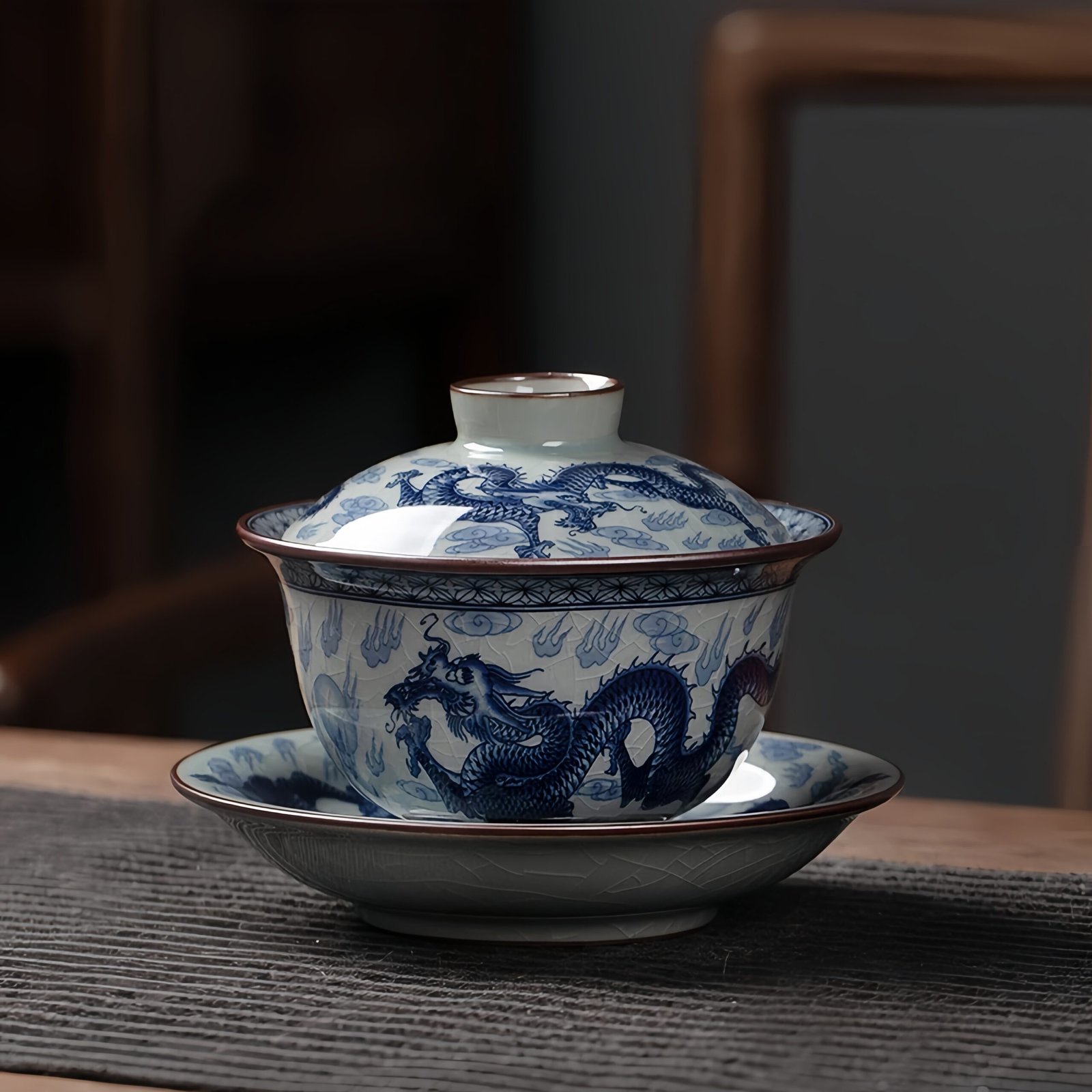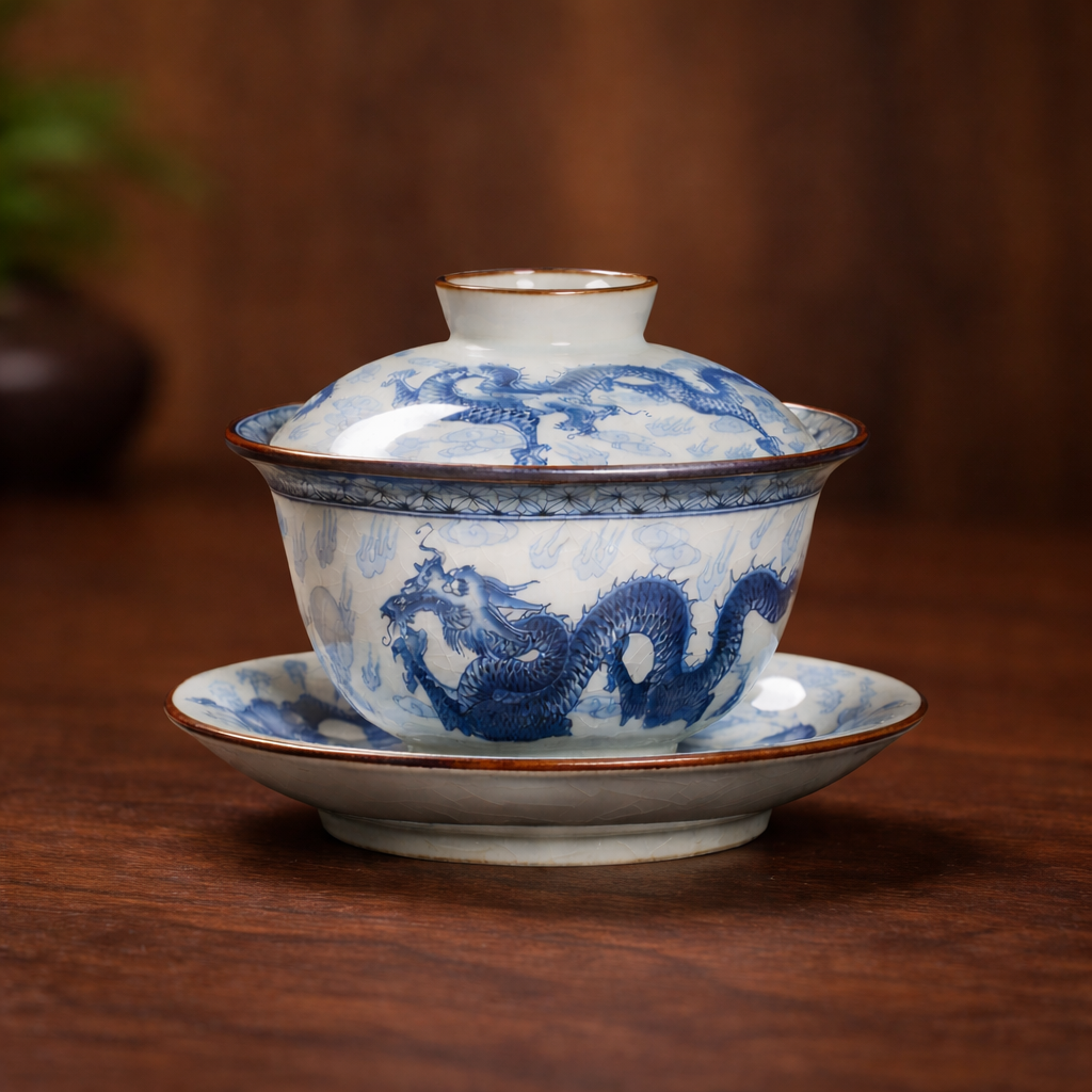 This three-piece Gaiwan tea set is crafted using traditional blue and white porcelain artistry, combining old clay materials with a refined antique aesthetic. The natural crackle glaze on the surface exudes a timeless elegance, while the vibrant dragon-and-cloud motif painted with deep blue hues brings a sense of power and vitality. Its meticulously crafted contours and vintage-style detailing such as brown-glazed accents on the rim and saucer edge make it a truly unique addition to your tea ware collection.