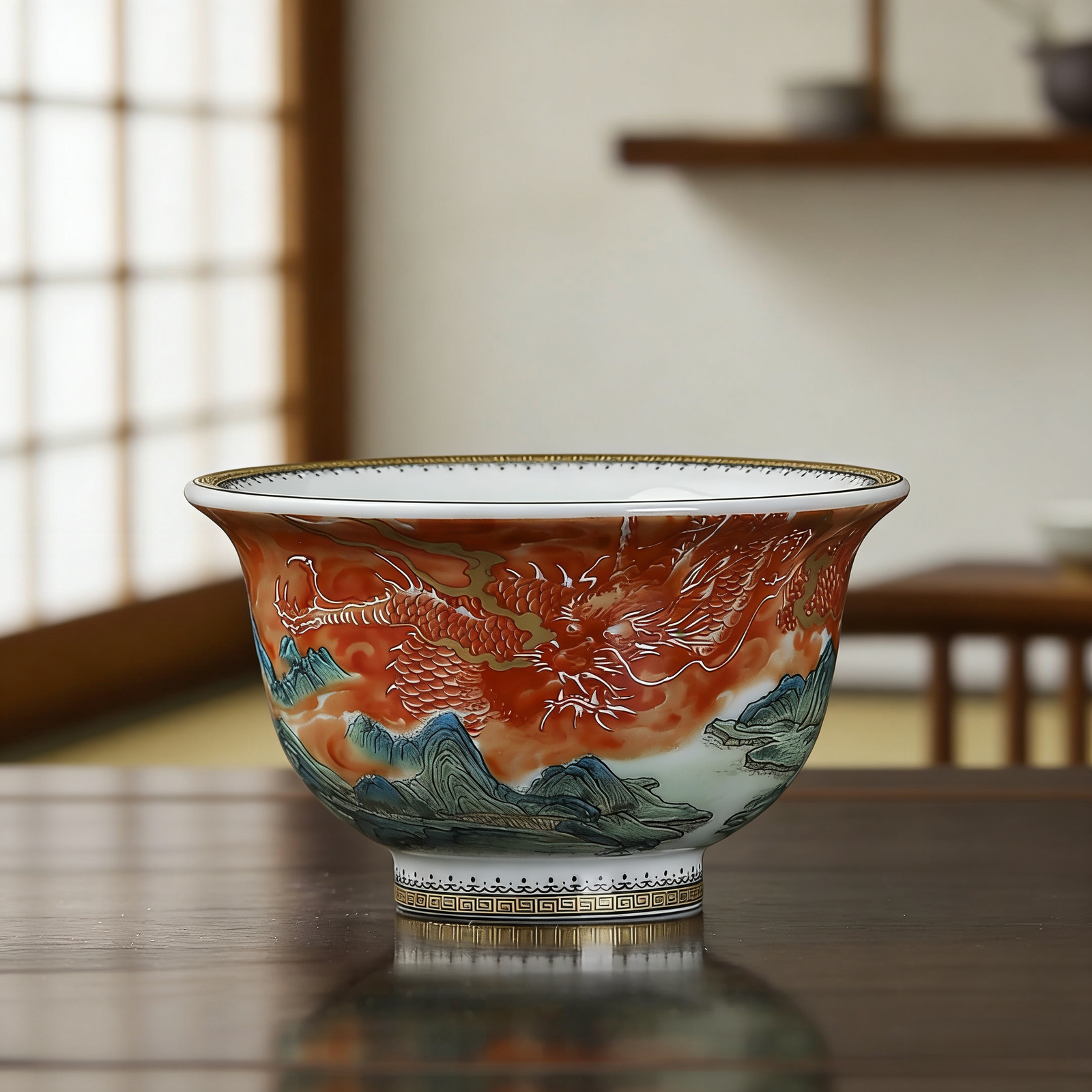 The teacup features a majestic red-glaze dragon depicted with intricate scales and a fierce demeanor, with golden accents outlining its contours for a striking visual effect. Complemented by vibrant green mountain motifs, the design achieves a seamless balance of power and tranquility. Its flared rim and elevated foot structure embody smooth, flowing lines, offering both a comfortable grip and a regal aesthetic. More than a cup, it serves as a stunning centerpiece for tea rituals.