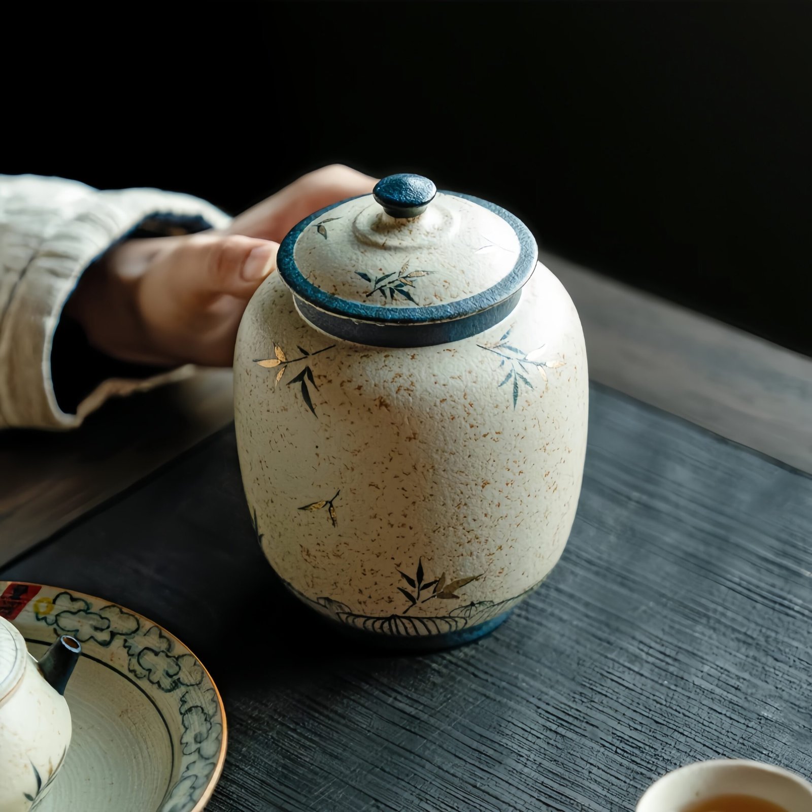 The jar features a rounded body with a meticulously shaped base and lid that highlight minimalist Eastern design. The bamboo motif, painted with graceful strokes on an off-white background, symbolizes peace and prosperity. This functional art piece embodies an understated Zen-inspired appeal, making it perfect for complementing any tea ceremony or living space.