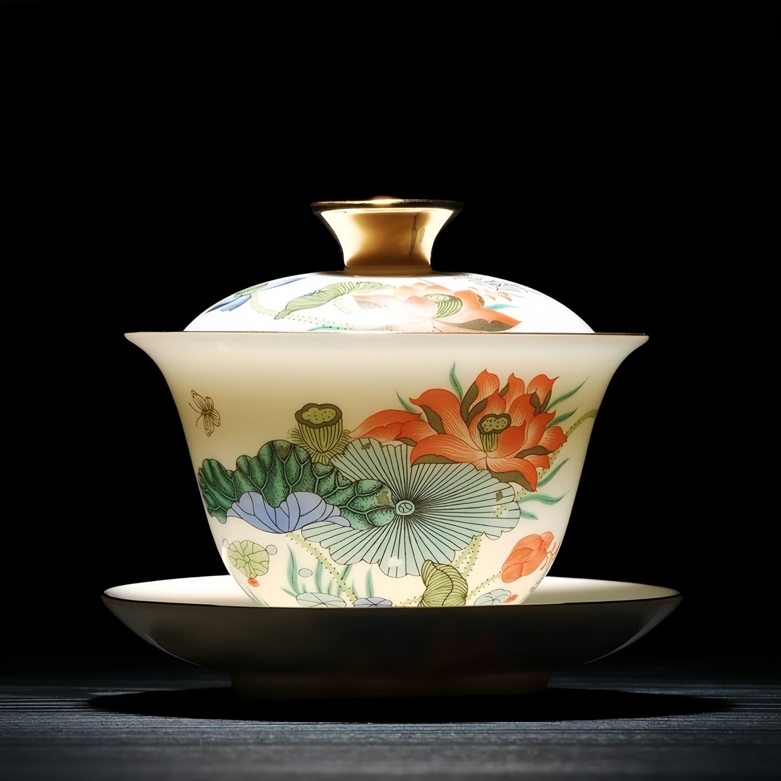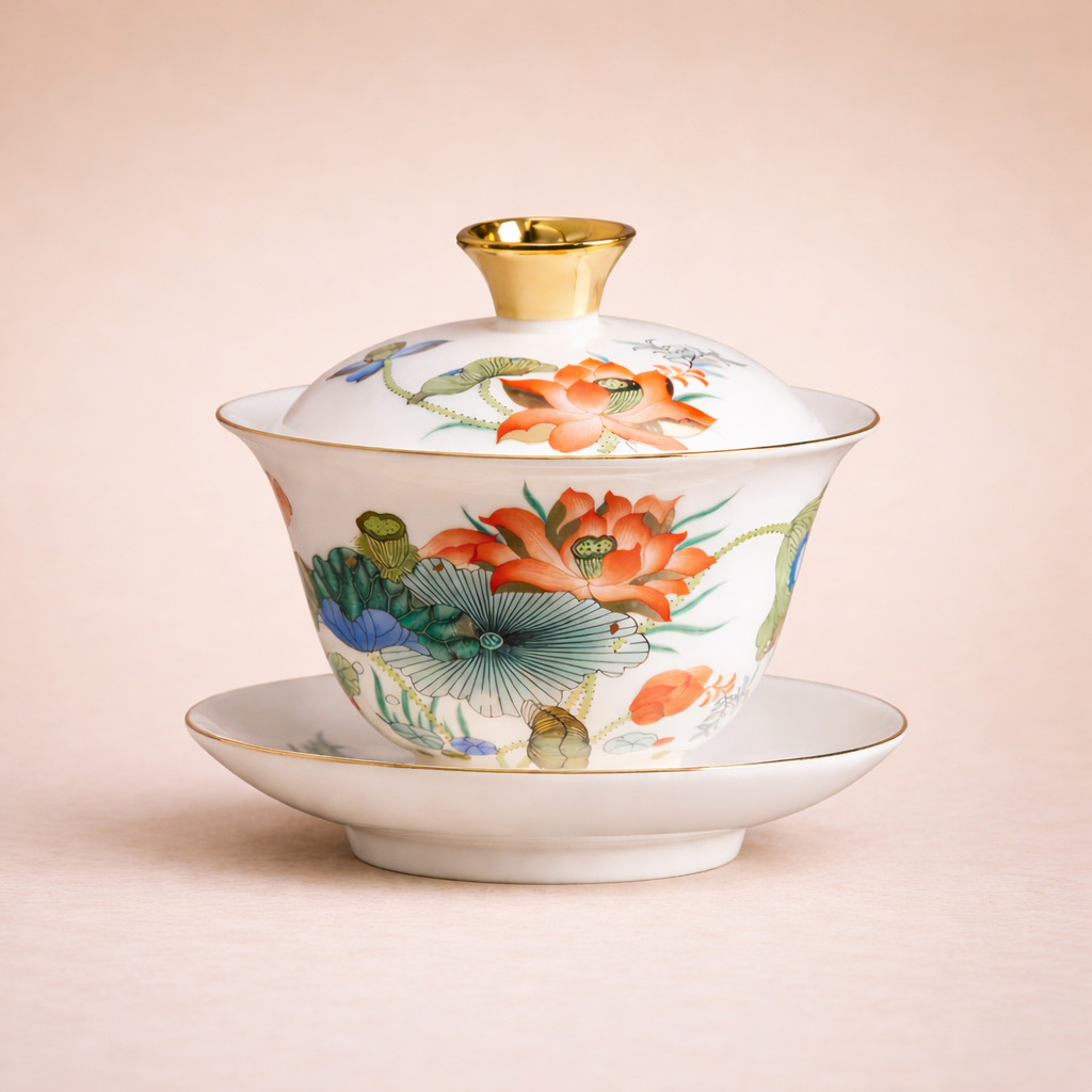 Elegant Gaiwan Chinese tea set in fine porcelain, featuring hand-painted lotus design and timeless beauty for refined tea rituals.