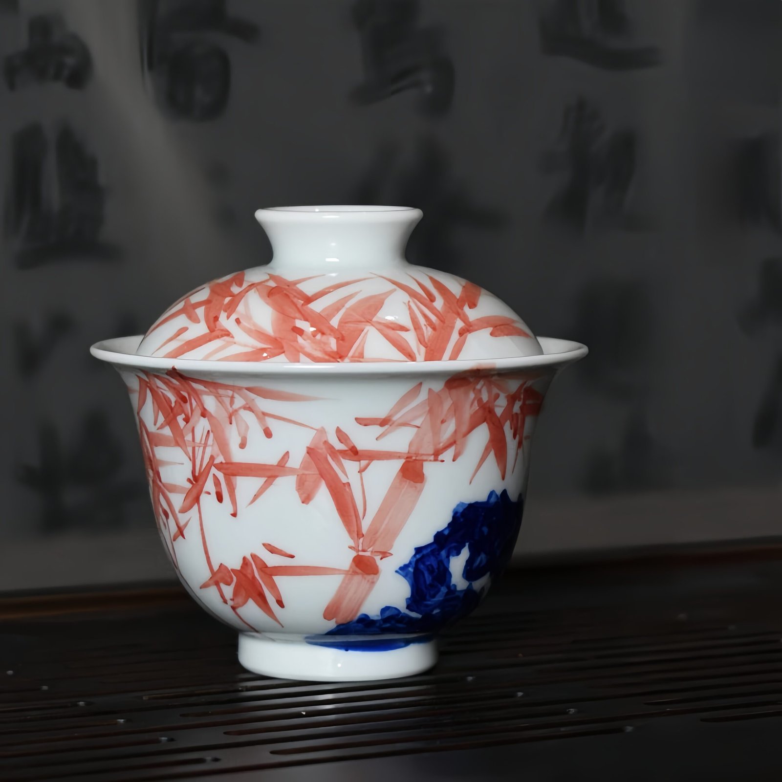 Crafted with premium white porcelain, this Red Bamboo Gaiwan stands as a testament to the intersection of tradition and artistry. The lustrous glaze resembles polished jade, while the underglaze painting technique breathes life into the design. Detailed red bamboo branches showcase bold and graceful strokes, reflecting the timeless resilience of bamboo, while delicate blue accents depict serene lakeside stones, adding sophistication to the overall composition. The harmonious red and white color palette brings a pleasant vibrancy to your tea ceremony.