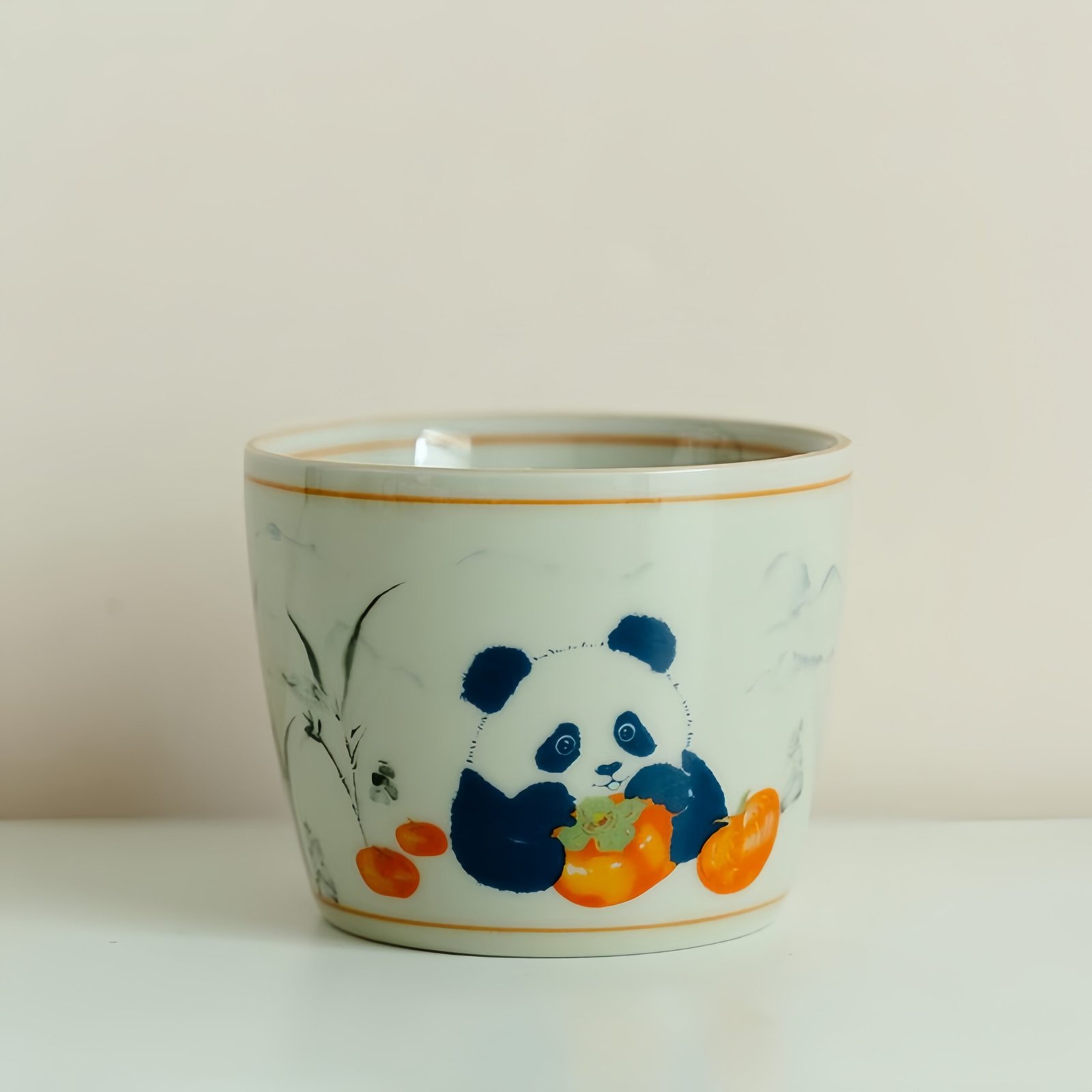 Discover the charm of our handcrafted panda mug, exquisitely made through meticulous hand-painting techniques. Its thoughtful design features a sleek cylindrical shape, smooth lines, and a minimalist, elegant style. This 235ml mug is perfectly sized for your everyday tea or coffee moments. Adorned with an enchanting illustration of a playful panda hugging a vibrant persimmon, complemented by delicate ink brush landscapes and bamboo patterns, this mug brings a refreshing and soothing visual experience to your table.
