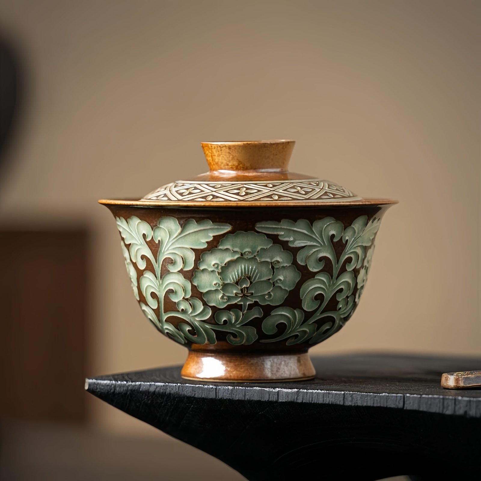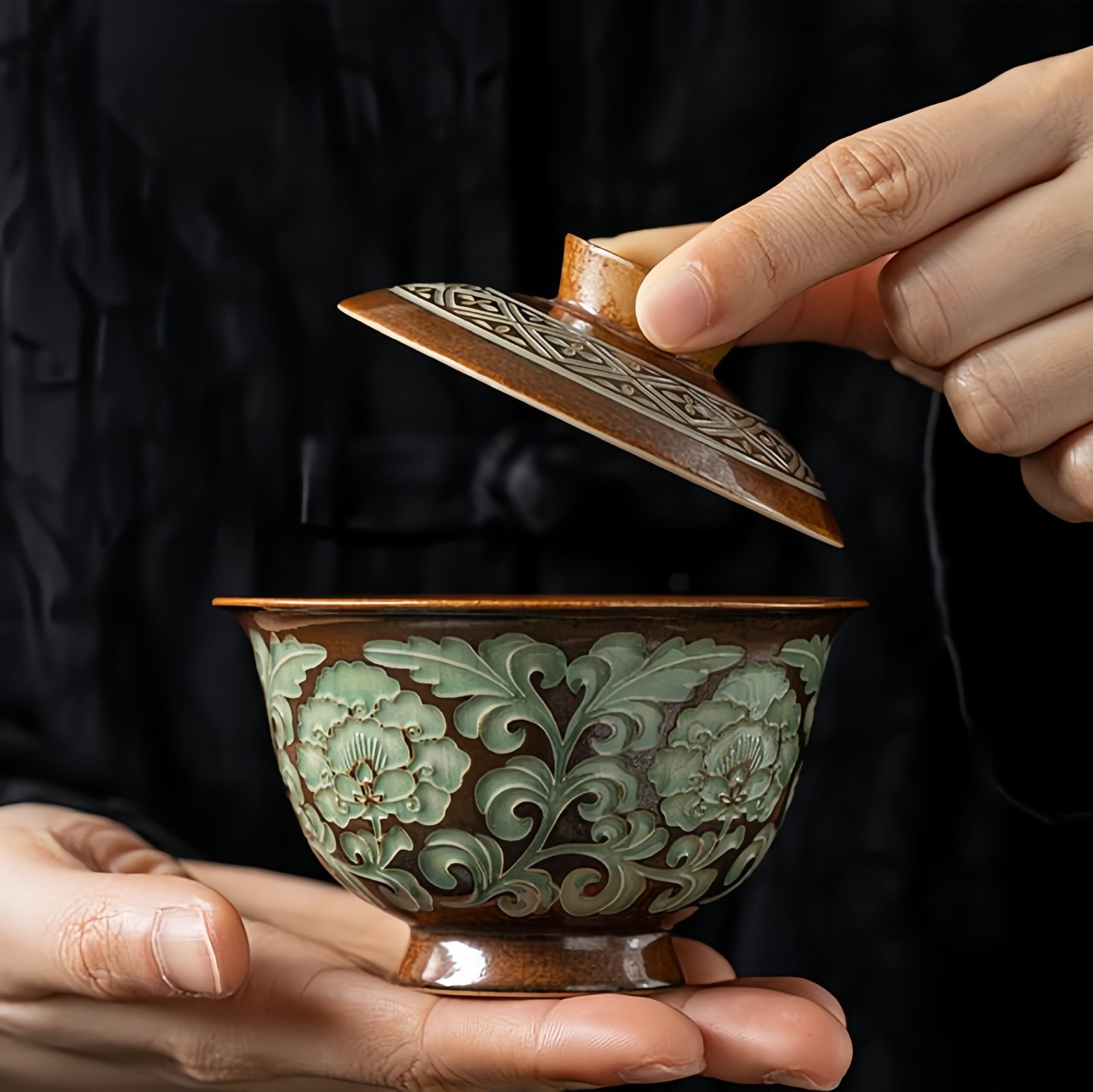 The craftsmanship shines in its embossed floral carvings adorning the exterior. The peony and trailing branches are meticulously rendered, with layered petals and flowing leaves providing remarkable depth and realism. The warm brown glaze base contrasts sharply against the cool green embossed patterns, delivering visual intrigue and a sense of rustic charm. The polished, pristine inner wall facilitates easy cleaning, elevating both practicality and artistry in one intricate tea vessel.