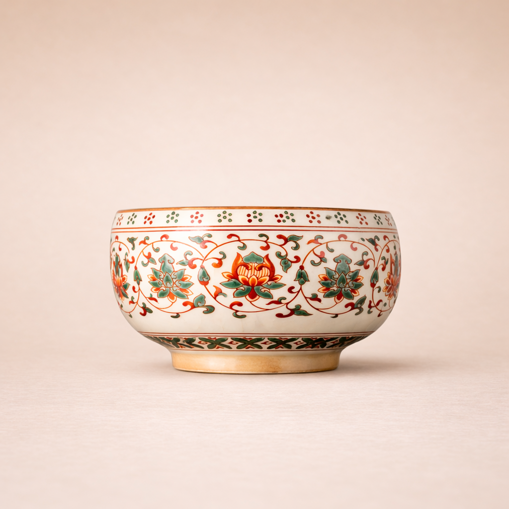 This teacup is made from fine white porcelain and adorned with intricate hand-painted patterns using vibrant red and green ancient pigments. The twining lotus patterns are gracefully detailed, with flowing lines that demonstrate extraordinary precision and lively expression. The rim and base are accentuated with vintage-style edging, adding layers of beautiful detail. The glossy glaze features natural textural cracks, while the retro brown rim enhances the overall aesthetic.